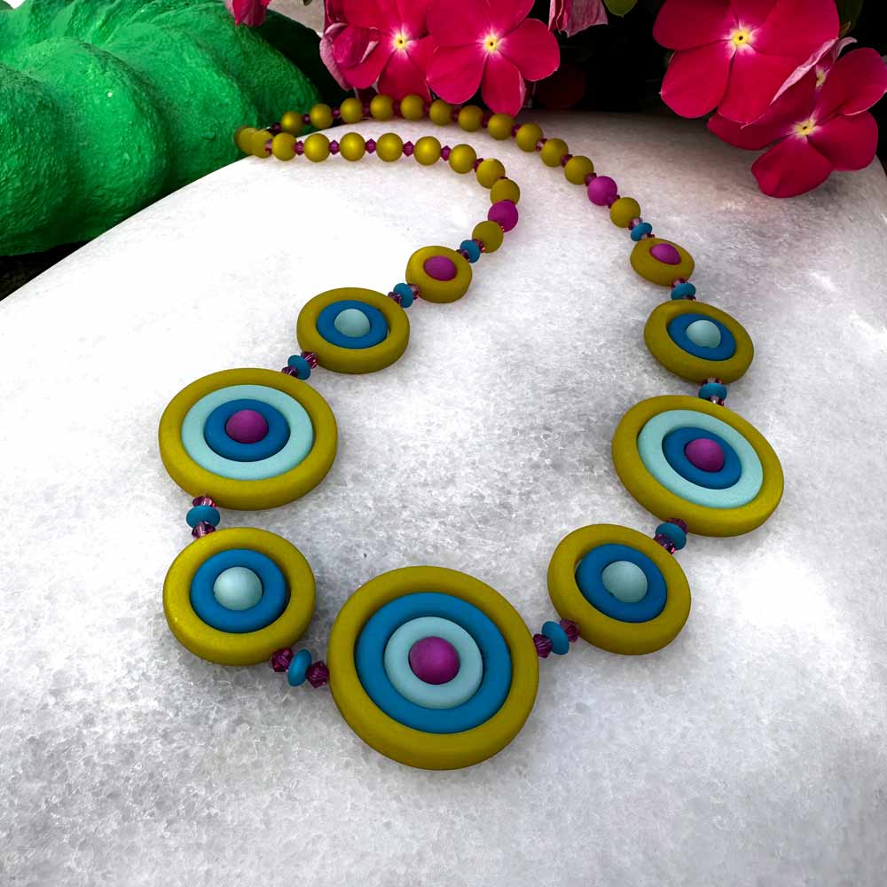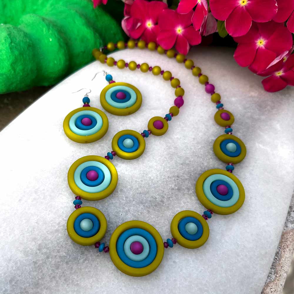33mm circular Polaris beads in olive green outside & 25mm in royal & marine blue inside in the middle & 16mm circles in royal or marine with 8mm in the center in olive & little discs in olive green & montana blue crystal elements, 6x10mm Polaris tubes in olive green leading to the back